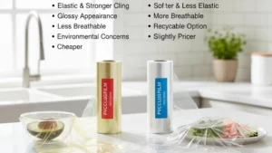 دليل فيلم الالتصاق PVC مقابل PE قارن الأداء والسلامة والتكلفة والأثر البيئي واحصل على نصائح خبراء للشراء للأسواق الكبرى والمطاعم والمصانع الغذائية